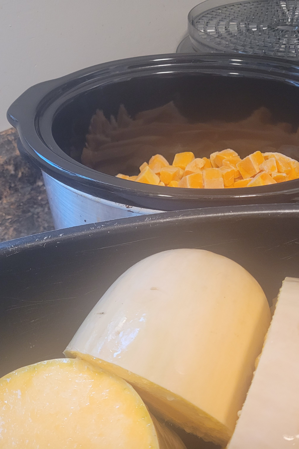 On this day, I added my frozen cubed butternut squash to one crockpot and a freshly chopped butternut squash to another. After they have cooked for a little while, I will add them together into one crockpot, blend, and add spices.