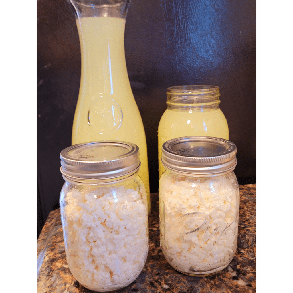 I was able to get 2 pints or 1 quart of ricotta cheese and 2 quarts of whey from a half gallon of whole milk! I will be using the whey for making bread and pancakes! One of my quarts of whey is in a cute pitcher!