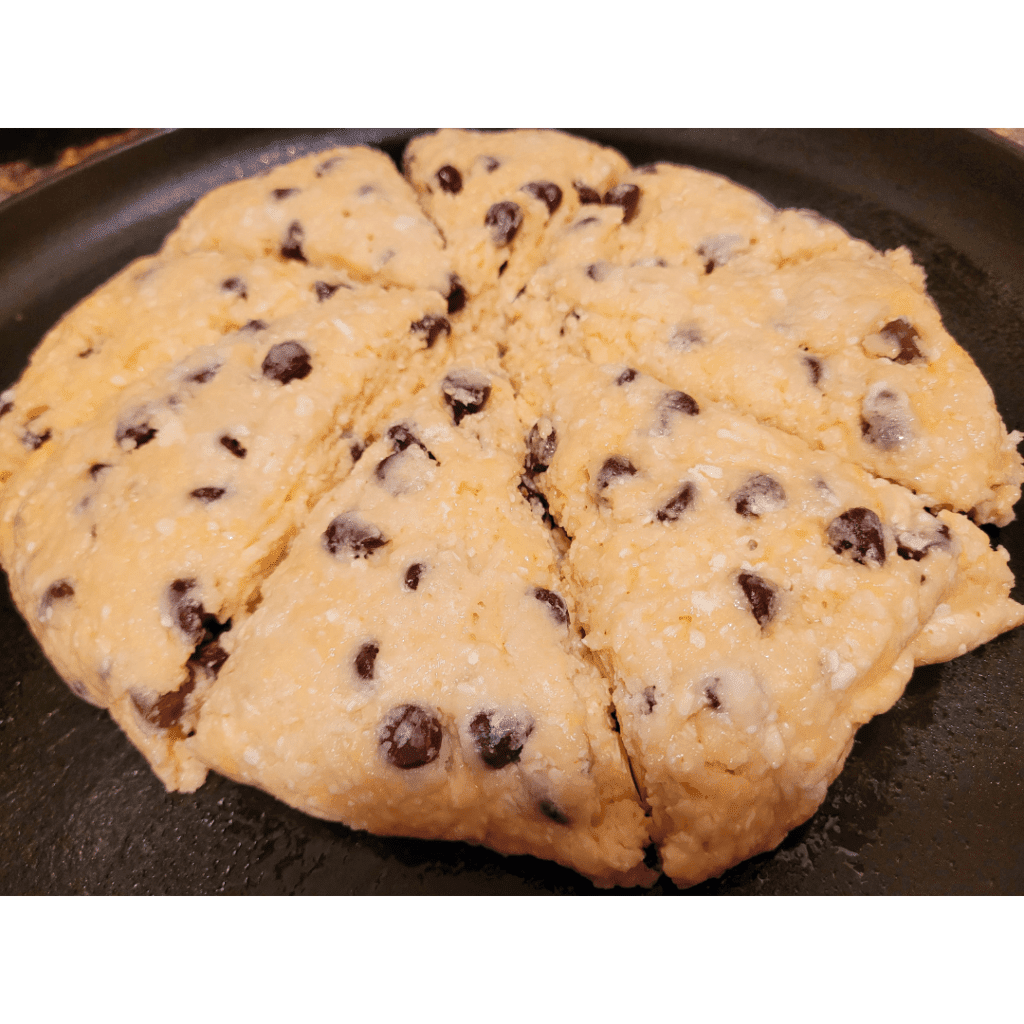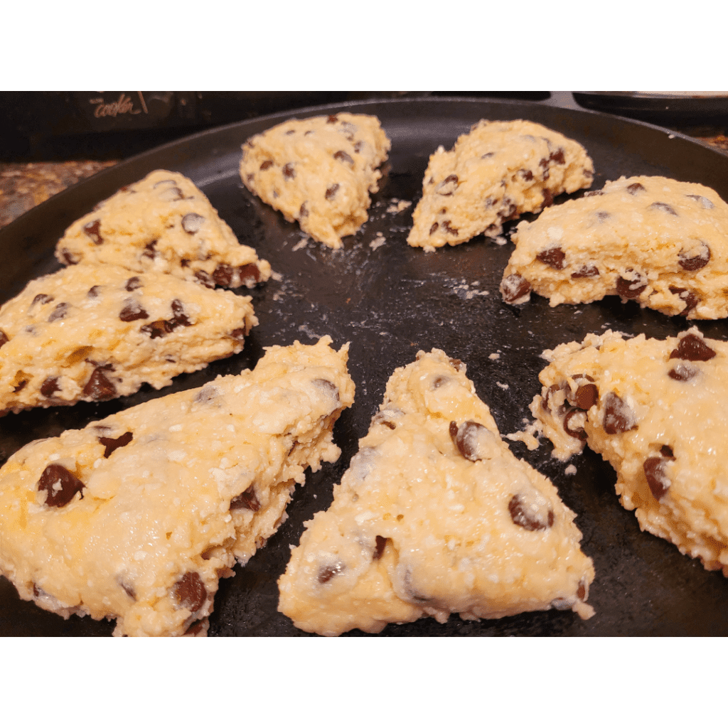 Cut the disc into 8 equal parts like you are slicing a pizza. Separate the scones a bit away from each other. Note, I did not use parchment paper and just used my cast iron pizza pan.